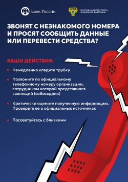 Генеральной прокуратурой РФ совместно с Банком России разработаны профилактические мероприятия, направленные на обеспечение осмотрительности граждан в условиях возможного использования злоумышленниками телекоммуникационных сетей. В связи с чем, разработаны цифровые плакаты в целях повышения уровня информированности населения о действиях лиц, вводящих в заблуждение в целях хищения денежных средств.